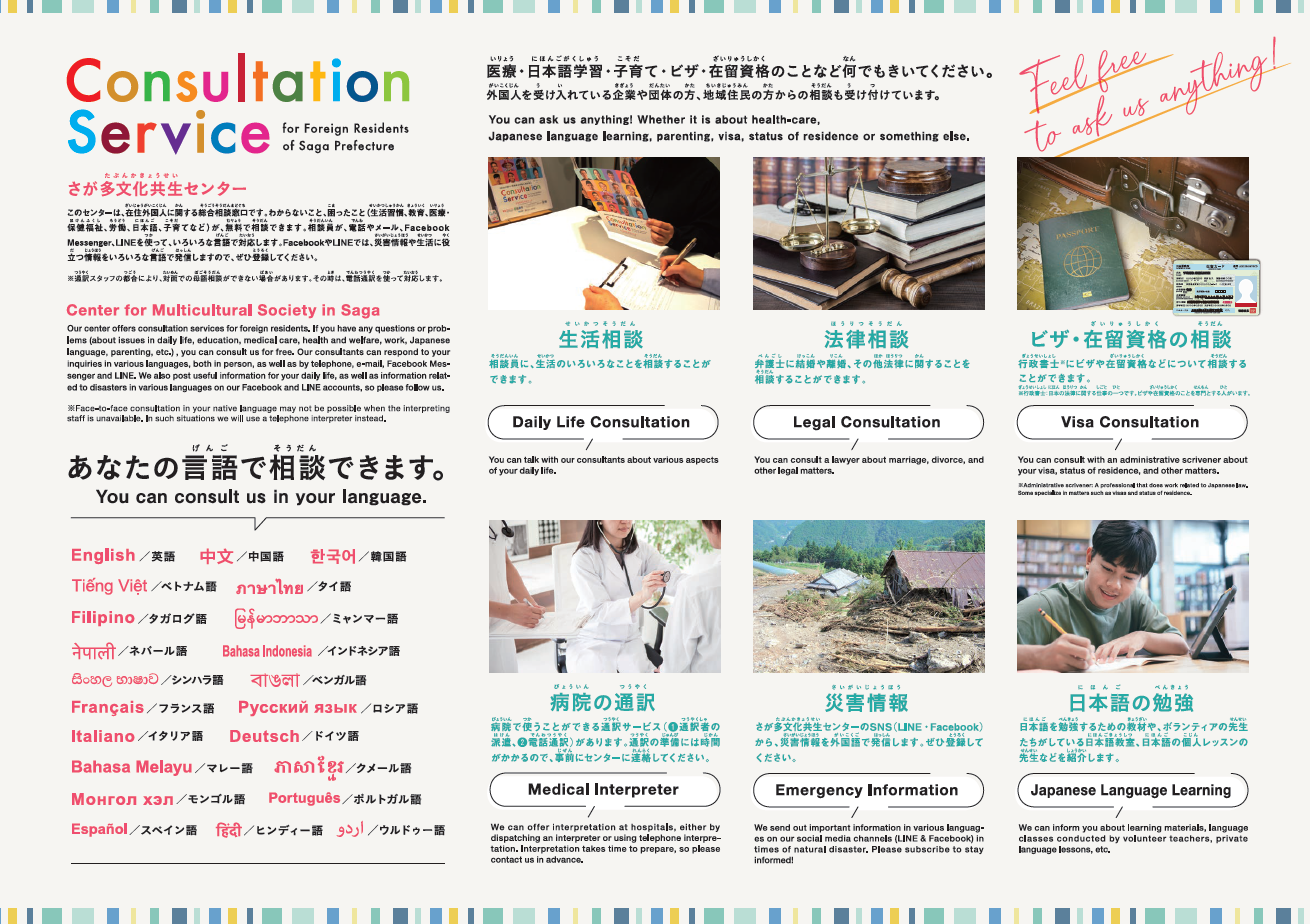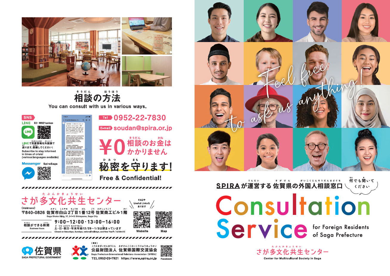 このセンターは外国人も日本人も、もっとみんなが暮らしやすい佐賀県を目指すためのセンターです。分からないこと、困ったこと(生活習慣、教育、医療・保健福祉、労働、日本語、子育て)が、無料で相談できます。外国人住民のみでなく、事業所など、地域の皆さんからも相談を受け付けます。専任の相談員が、電話やメール、Facebook、LINEを使って22の言語で対応します。