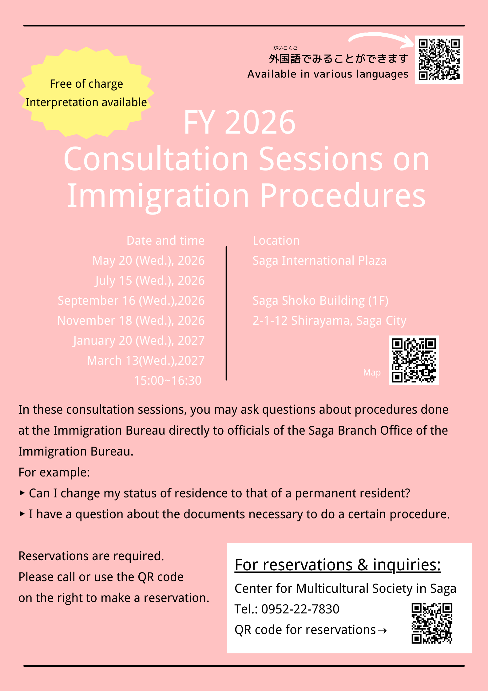 In these consultation sessions, you may ask questions about procedures done at the Immigration Bureau directly to officials of the Saga Branch Office of the Immigration Bureau.