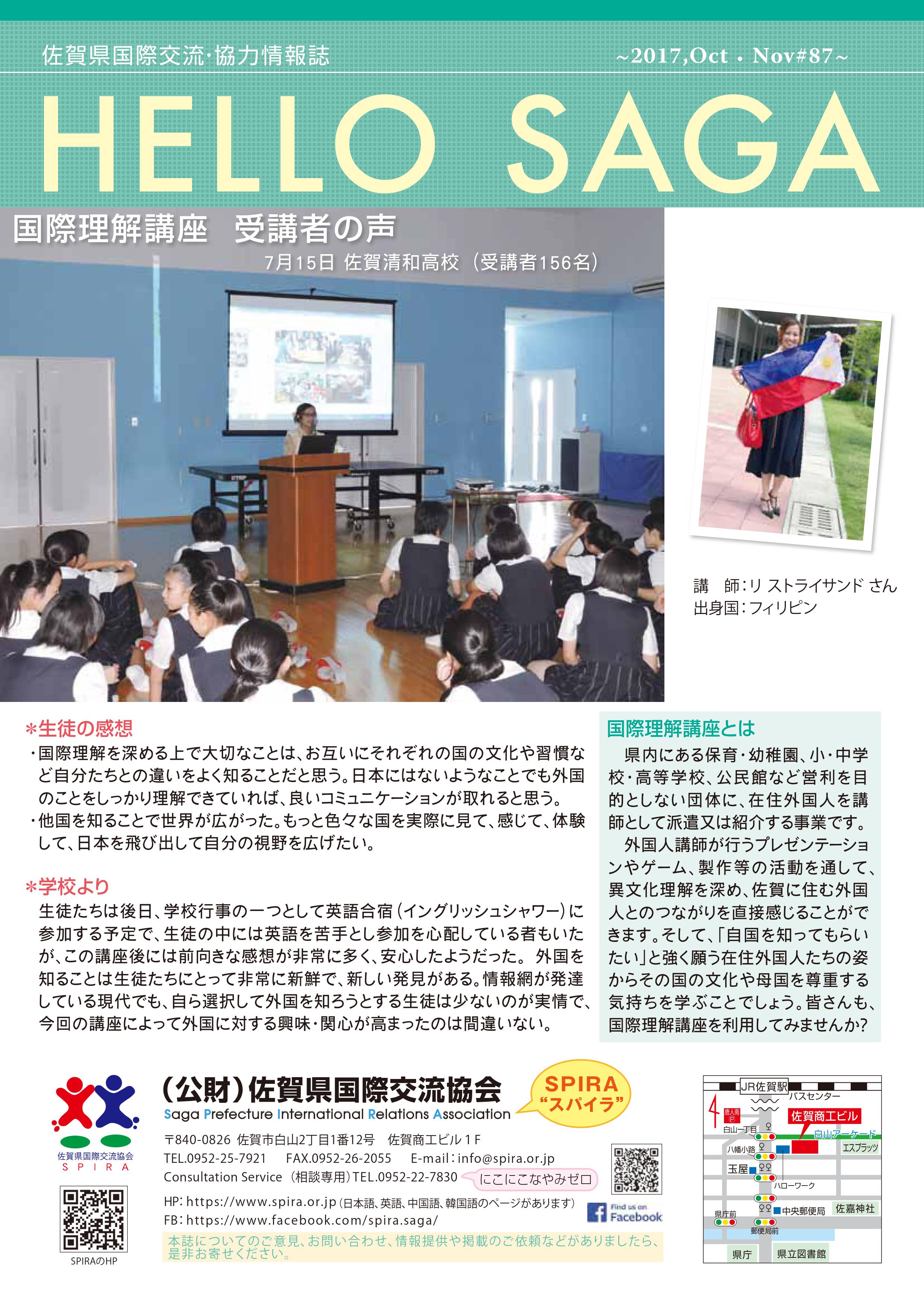 HELLO SAGA(日本語)は、県民に、県・当協会(SPIRA)及び県内の民間国際交流団体等の国際交流・協力や多文化共生事業に関する情報を配信しています。